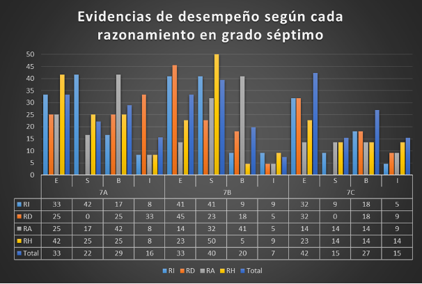 Mientras que en grado sexto el razonamiento con mejor desempeño fue el razonamiento inductivo, en grado séptimo los dos razonamientos con mayor cantidad de “excelentes” fueron el razonamiento deductivo y el inductivo (obteniendo el mismo total de estudiantes). Como se había anticipado en la hipótesis, estos tipos de razonamiento al ser los más trabajados en los dos cursos tendrían mejores resultados.