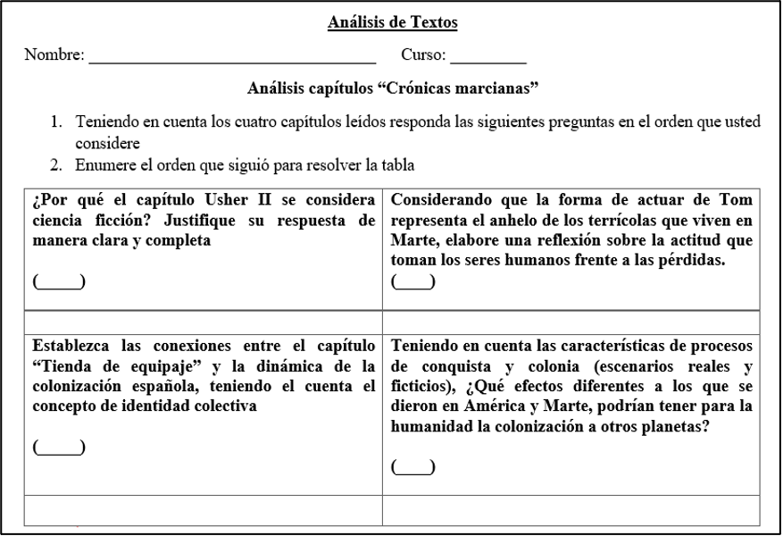 El procedimiento realizado con cada grado fue el siguiente: en sexto se hizo, en primer lugar, un acercamiento teórico correspondiente a los tipos de razonamiento apoyado por el uso de gráficas. Segundo, este ejercicio puntual se hizo con la lectura de un capítulo de Crónicas marcianas en el que se pudieran establecer comparaciones entre historia y literatura a través de conceptos. Los anteriores se trabajaron en las asignaturas Análisis de Textos y Realidad Nacional y Latinoamericana en la que se hicieron conexiones entre la Colonia en mundos reales y ficticios. En tercer lugar, los estudiantes se enfrentaron al ejercicio de preguntas asociadas a cada tipo de razonamiento en una sesión de evaluación formal de 80 minutos.