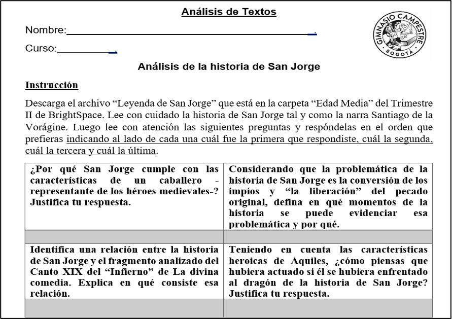 En grado séptimo los estudiantes se enfrentaron a la lectura del texto “La leyenda de San Jorge” de Las leyendas áureas de Santiago de la Vorágine. En segundo lugar, se les pidió que identificaran conceptos centrales de la lectura (ética, estética, libertad). A continuación, se hizo una lectura de un segundo texto (El libro séptimo de la Divina Comedia) con el cual se pudiera hacer una relación intertextual. En cuarto lugar, los estudiantes se enfrentaron a la solución de un examen formal de 80 minutos, donde resolvieron cuatro preguntas diseñadas para esta prueba.
