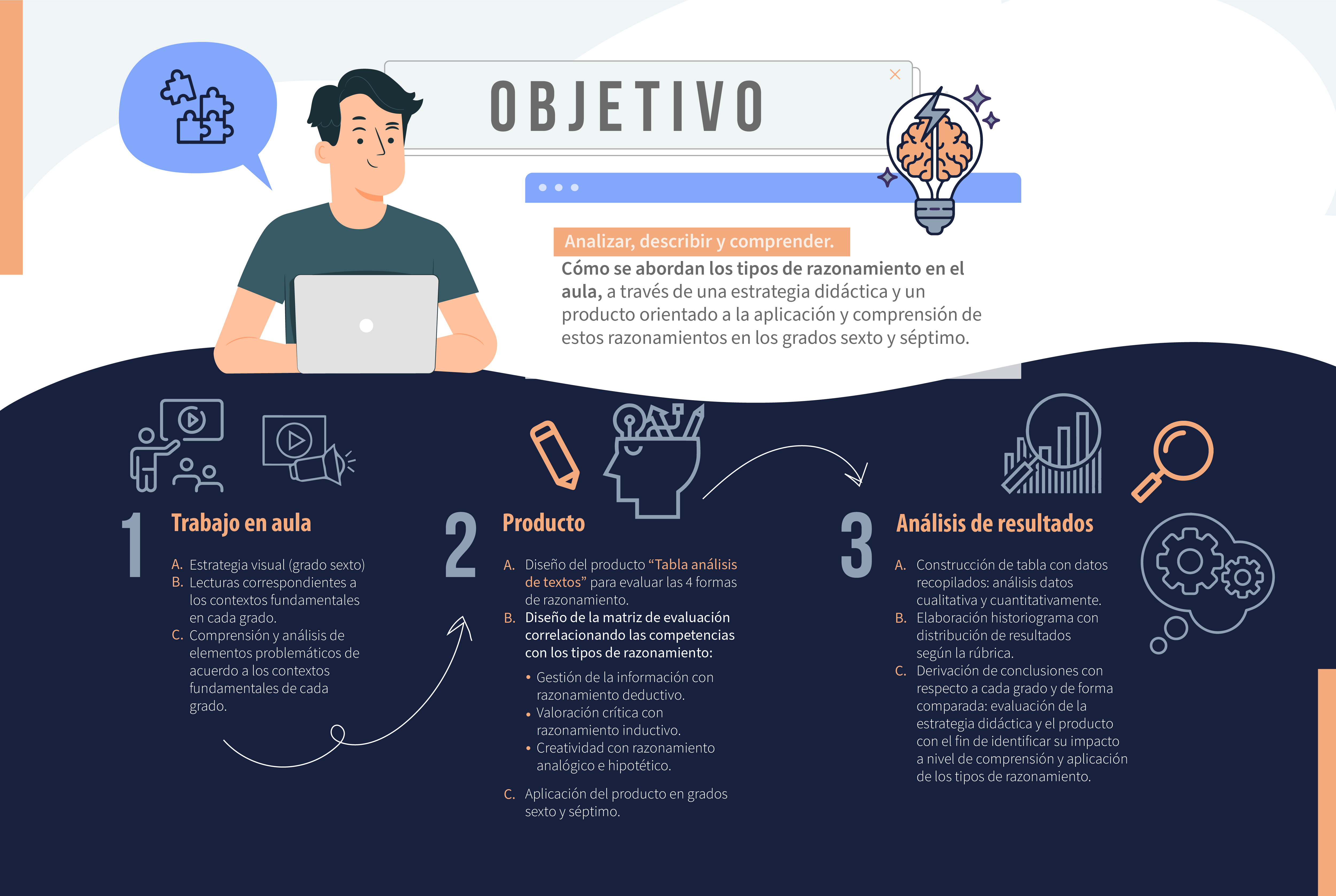 Con el fin de analizar la pregunta se hizo necesario plantear como objetivo general la construcción de una propuesta didáctica. Esta debe permitir la integración de los cuatro tipos de razonamiento en las etapas de planeación y ejecución en aula. Además, debe facilitar la propuesta de herramientas efectivas desde la práctica pedagógica para mejorar el desempeño de los estudiantes. Lo anterior se ha propuesto teniendo en cuenta que cada tipo razonamiento es necesario en el desarrollo de procesos cognitivos que deriven en un nivel de pensamiento complejo en estudiantes de entre 12 y 14 años.