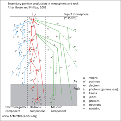El primero es el componente electromagnético (parte izquierda de la gráfica), que consiste en el decaimiento de un pión, en radiación gamma la cual a su vez puede decaer en un electrón y un positrón (par materia-antimateria) (Abe Pacini, 2017). El segundo componente es el mesónico en el cual los piones se descomponen en muones y anti-muones los cuales pueden decaer en electrones (electromagnético) o en neutrones secundarios (nucleónico). Los muones tienen un tiempo de decaimiento de 2.2 µ el cual es menor al tiempo de vuelo en la atmósfera el cual es de 40 µ segundos, pero ellos pueden ser identificados a nivel de superficie terrestre debido a las velocidades relativistas que generan una dilatación en el tiempo. Por otro lado, los muones pueden llegar al nivel de la superficie terrestre porque interactúan levemente con la materia atmosférica y solo producen ionización (Abe Pacini, 2017).