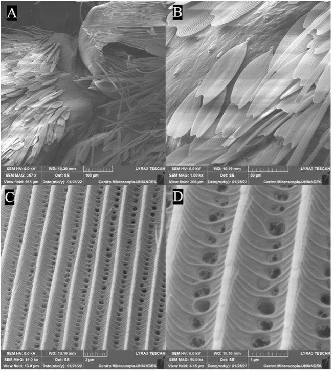 Figura 4 A. La unión entre el torso y el ala de la polilla. B. Escamas que recubren la estructura principal. C. Canales que se presentan en las escamas y agujeros en el mismo. D. Mayor ampliación a los canales presentes en las escamas y sus agujeros.