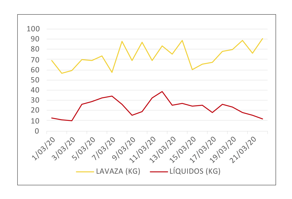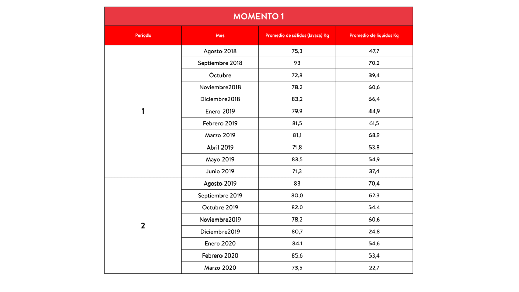 Al analizar el comportamiento del promedio en los tres periodos (tabla 2) se observa que el periodo 3 (octubre de 2020 a septiembre de 2021) reportó el promedio de desperdicio de lavaza más alto con 91.9 kg, seguido del periodo 2 (agosto 2019 a marzo 2020) con 81 kg y el periodo 1 (agosto del 2018 a junio del 2019) con 78,4 kg registra el desperdicio más bajo. Por otro lado, en cuanto el desperdicio de líquidos se observó que la mayor cantidad se presentó en el periodo 1, es decir entre agosto del 2018 y junio del 2019 con 55.1 Kg, seguido del periodo 2 con 5.4 kg; el periodo 3 con 8.8 Kg es el promedio más bajo (tabla 2).