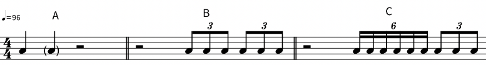 Ahora, en la sección B, como se puede ver en la Figura 9, la célula rítmica cambia para acentuar los tiempos 1 y 3, y contar con más golpes, por lo que le agrega cierto sentido de rapidez. El ritmo se acopla al instrumental Rich Girl (Figura 3), omitiendo la melodía y con una pequeña variación en el tercer tiempo, y al instrumental Punder (Figura 5), con ciertas variaciones en cuanto a la voz de arriba. Ese patrón rítmico varía con 3 transiciones rítmicas que se utilizan en ciertos momentos de la sección. El patrón A, simplemente acentúa los tiempos 1 y 2, para omitir el ritmo por los siguientes dos tiempos; el patrón B utiliza tresillos para dar una sensación de movimiento en los tiempos 3 y 4; y el patrón C es una variación del B, donde el tiempo 3 contiene un seisillo, por lo que la sensación de movimiento es mayor.