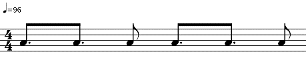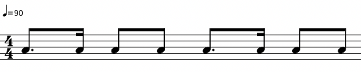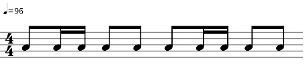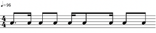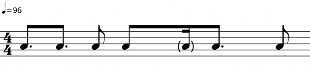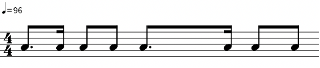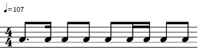 Como se puede apreciar en la Figura 6, los tiempos 2 y 4 están compuestos de dos corcheas que marcan la mitad de un tiempo, mientras que los tiempos 1 y 3 varían. En cuanto a los 5 samples básicos, el ritmo se acopla a la voz de arriba de “Hot this year” (Figura 2), con cierta variación en el tiempo 3, donde en vez de haber una corchea con puntillo y una semicorchea, hay una corchea y dos semicorcheas. El instrumental “Bam Bam” (Figura 4) también se acopla, con la misma variación. Sin embargo, no cuenta con la melodía característica de su célula rítmica.