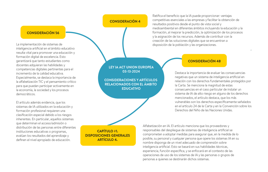 Uno de los grandes referentes legislativos sobre la IA es la recién sancionada Ley IA ACT de marzo 13 de 2024 en la Unión Europea. En el cuerpo del documento se evidencian consideraciones relacionadas tanto con los principios éticos antes descritos como con la necesidad de involucrar al sector educativo como actor primordial garante de la formación de los ciudadanos frente a los temas relacionados. A continuación, se extractan algunos artículos que mencionan de manera directa dichas relaciones.