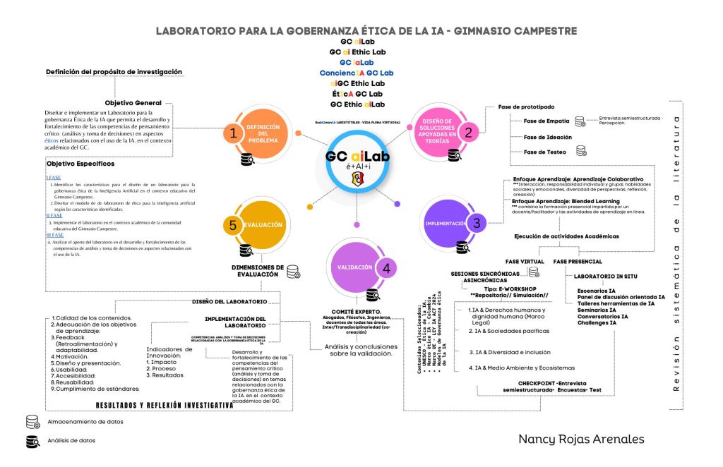 La inteligencia artificial ha transformado la percepción del mundo y el sector educativo no es ajeno a esa transformación. La omnipresencia de esta tecnología plantea preguntas cruciales sobre la relación con el entorno y con la propia vida que deben ser abordadas con información y responsabilidad desde la etapa escolar. Por consiguiente, el diseño y la implementación del laboratorio para la Gobernanza Ética de la IA en el Gimnasio Campestre, se considera de vital importancia para consolidar la formación de la comunidad educativa en torno a temas cruciales relacionados con la IA, especialmente los temas relacionados con los derechos y la dignidad humana.