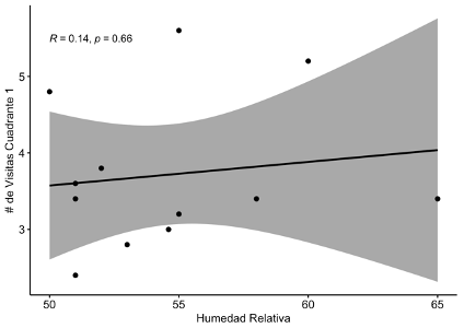 La figura 5 muestra la relación entre las visitas en el cuadrante 1 y la humedad relativa; cada punto representa los días de muestreo. La línea en la mitad del diagrama muestra la tendencia de los valores. Al ser mayor que 0,05, se concluye que no existe correlación entre la humedad y las visitas del cuadrante 1.