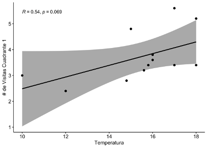 La figura 6 muestra la relación entre las visitas en el cuadrante 1 y la temperatura. A pesar de que se puede ver una tendencia directamente proporcional entre las dos variables, el valor de p= 0,069 muestra que no hay una correlación entre las dos variables.