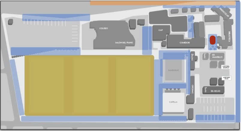 Figura 1. Mapa del Gimnasio Campestre. Resaltadas en amarillo, las zonas abiertas, en azul los jardines, y en rojo el jardín de la biblioteca Francisco Posada Díaz, donde se realizó el muestreo