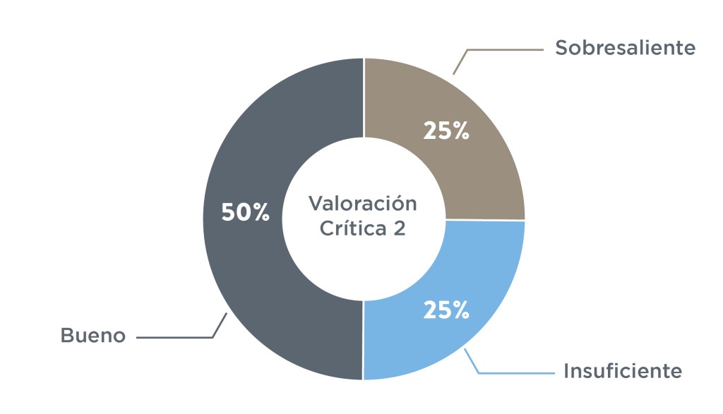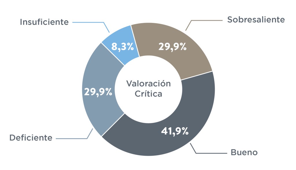 En los otros dos indicadores, los resultados fueron más regulares. En valoración crítica, el 42 por ciento de los estudiantes quedaron en bueno, mientras que en Valoración Crítica un tercio sacó sobresaliente y un tercio sacó bueno. En este último indicador, muchos no formularon a calidad sus ideas y no demostraron una idea clara de qué se trata el texto.