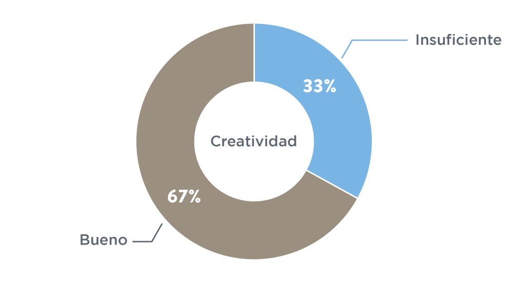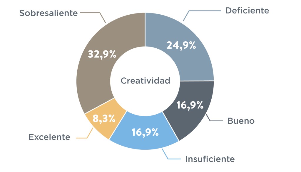 El indicador con los resultados más dispersos fue creatividad. Fue el único indicador en que un estudiante obtuvo excelente, y muchos sacaron notas de sobresaliente, pero también fue un indicador en que muchos estudiantes sacaron notas de insuficiente o deficiente. Es evidente que hay una gran brecha en este indicador. También hay una gran brecha en gestión de información dado que muchos estudiantes quedaron en sobresaliente y deficiente, con muy pocos en bueno.