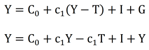 Donde el consumo (C) es igual al consumo autónomo C0 (el nivel de consumo que una persona realiza independientemente de sus ingresos), más la propensión marginal a consumir (c1) multiplicando al término de la renta disponible (Y-T), donde Y es la renta y el término (T) representa a los impuestos.