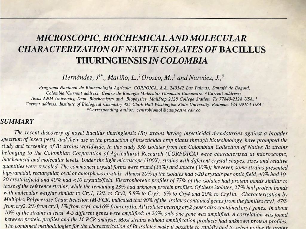 The recent discovery of novel Bacillus thuringiensis (Bt) strains having insecticidal d-endotoxins against a broader spectrum of insect pests, and their use in the production of insecticidad crop plants through biotechnology, have prompted the study and screening of Bt strains worldwide. In this study 336 isolates from the Colombian Collection of Native Bt strains belonging to the Colombian Corporation of Agricultural Research (CORPOICA) were characterized at microscopic, biochemical and molecular levels…