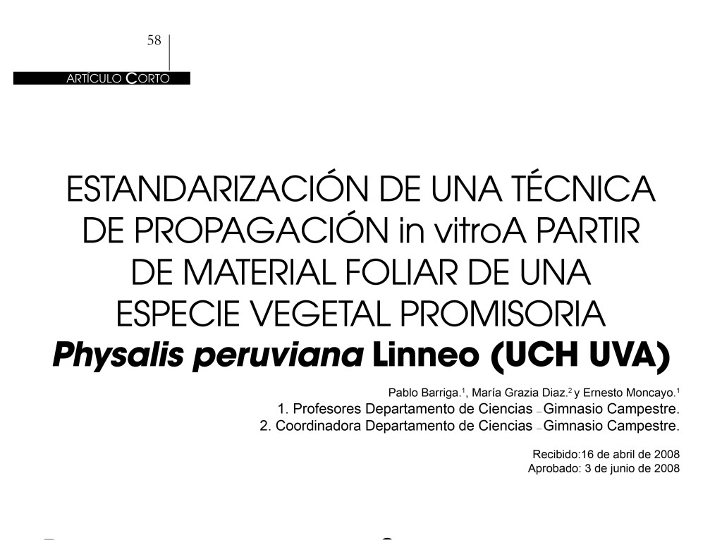 Estandarización de una técnica de propagación In vitro a partir de material foliar de una especie vegetal promisoria physalis peruviana linneo (uch uva)